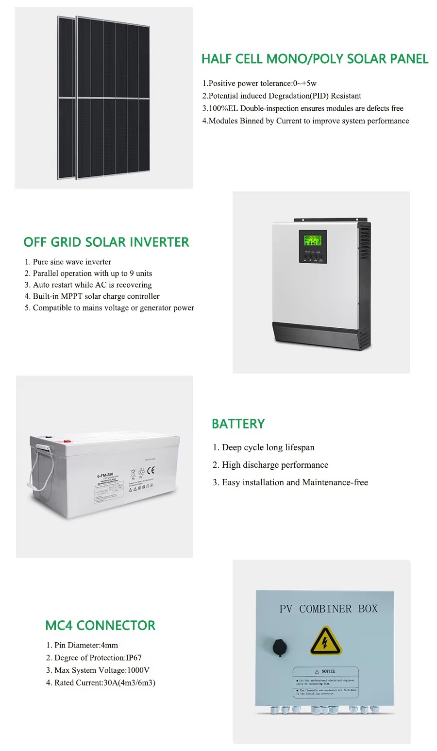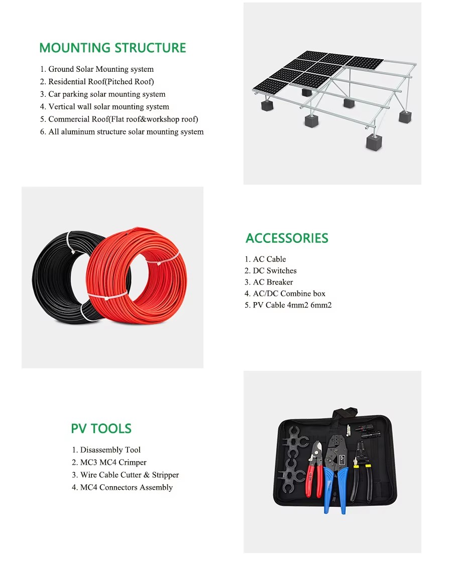 This off-grid solar power system offers versatile configurations with high-efficiency monocrystalline panels, customizable battery options (gel or lithium-ion), and tailored mounting systems. Suitable for home use, it supports various power outputs ranging from 5KW to 20KW, ensuring adaptability to installation conditions and energy needs.